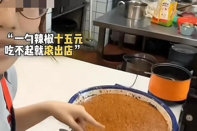 女生看到旁边有辣椒油还有一碗料汁,于是加了一勺辣椒汁,准备加料汁的时候却被拉面店的服务员制止了,拉面店店员说这是24元拉面才能加的,你这样九元的不能添加。